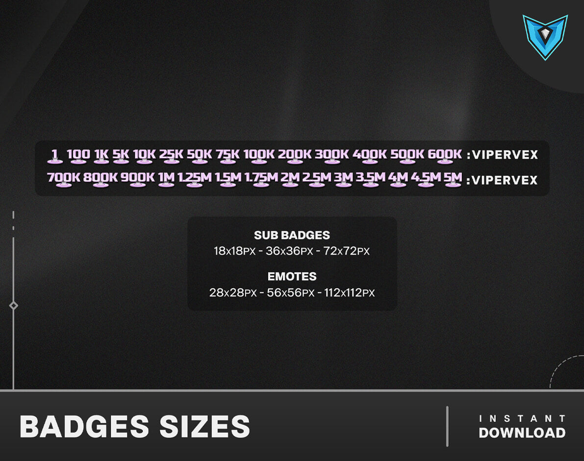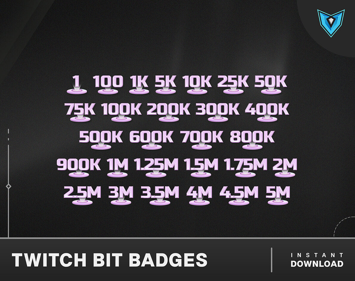 28x Twitch Twitch Bit Badges, available in three convenient sizes: 72x72, 36x36, and 18x18 pixels.